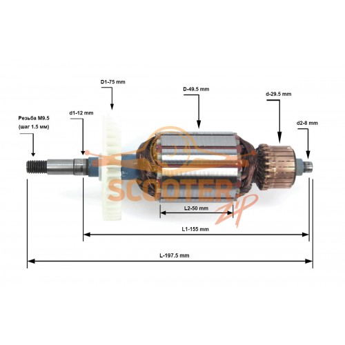Ротор (Якорь) ИНТЕРСКОЛ для рубанка Р-110/2000М (с 01.03.2012) (L-197.5 мм, D-49.5 мм, резьба М9.5 (шаг 1.5 мм))