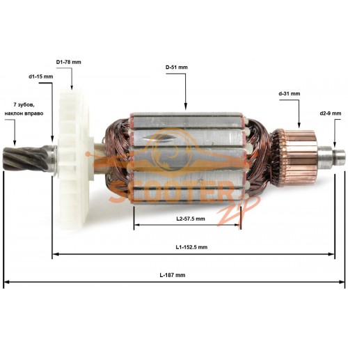Ротор (Якорь) ИНТЕРСКОЛ ДП-1900 (37.04.02.00.00) (L-187 мм, D-51 мм, 7 зубов, наклон вправо)