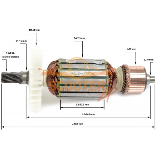 Ротор (Якорь) ИНТЕРСКОЛ ДП-190/1600M (97.04.02.01.00) (L-182 мм, D-47.5 мм, 7 зубов, наклон вправо)