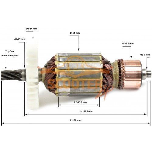 Ротор (Якорь) ИНТЕРСКОЛ ДП-210/1900M (98.04.02.01.00) (L-187 мм, D-54 мм, 7 зубов, наклон вправо)