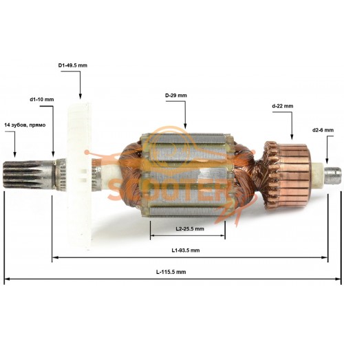 Ротор (Якорь) ИНТЕРСКОЛ ДШ-10/260Э односкоростной (L-115.5 мм, D-29 мм, 14 зубов, прямо)
