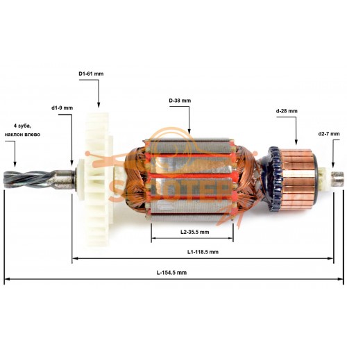 Ротор (Якорь) ИНТЕРСКОЛ ДУ-13/750ЭР нового образца (L-154.5 мм, D-38 мм, 4 зуба, наклон влево)