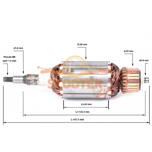 Ротор (Якорь) ИНТЕРСКОЛ ЛШМ -76/900 (L-147.5 мм, D-38 мм, резьба М6 (шаг 1.0 мм))