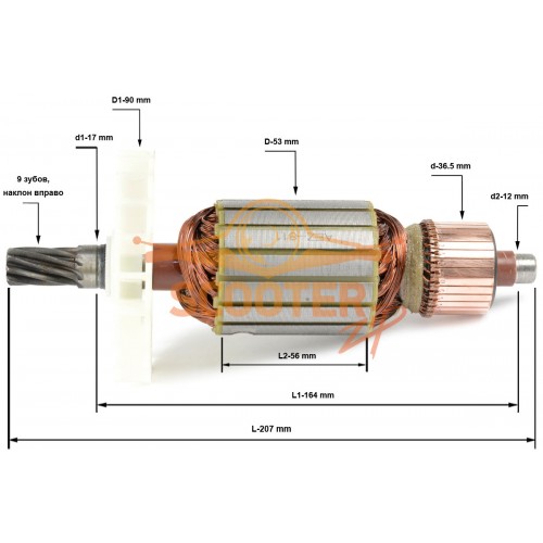Ротор (Якорь) ИНТЕРСКОЛ М25 и М30/2000В (L-207 мм, D-53 мм, 9 зубов, наклон вправо)