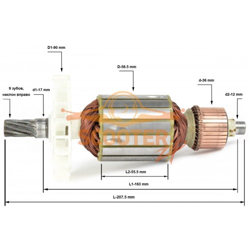 Ротор (Якорь) ИНТЕРСКОЛ М25 и М30/2000В (L-207.5 мм, D-56.5 мм, 9 зубов, наклон вправо)