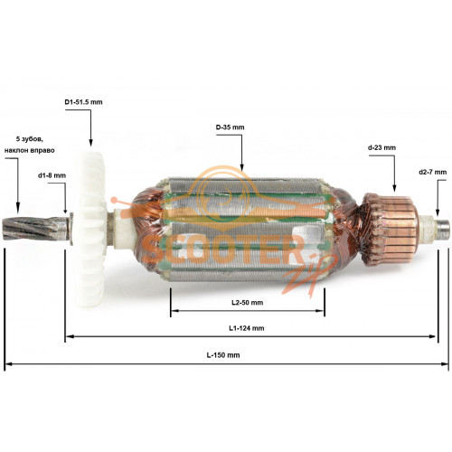 Ротор (Якорь) ИНТЕРСКОЛ МП-100Э, МП-100/700Э (L-150 мм, D-35 мм, 5 зубов, наклон вправо)