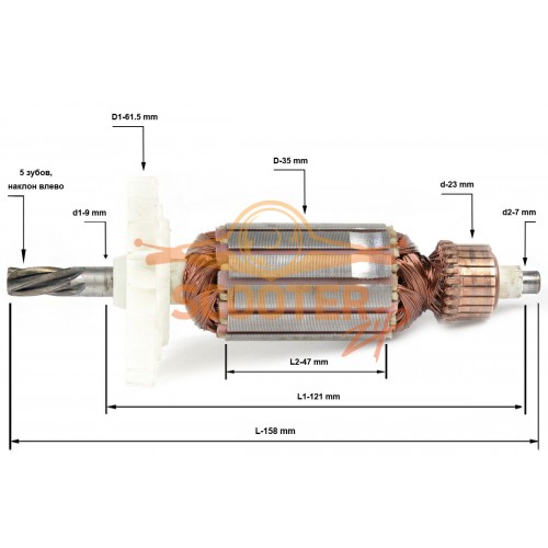Ротор (Якорь) ИНТЕРСКОЛ П30/900ЭР (86.04.02.01.00) (L-158 мм, D-35 мм, 5 зубов, наклон влево)