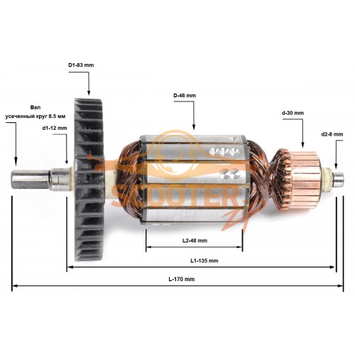 Ротор (Якорь) ИНТЕРСКОЛ ПЦ 16Т-01 (L-170 мм, D-46 мм, вал усеченный круг 8.5 мм)