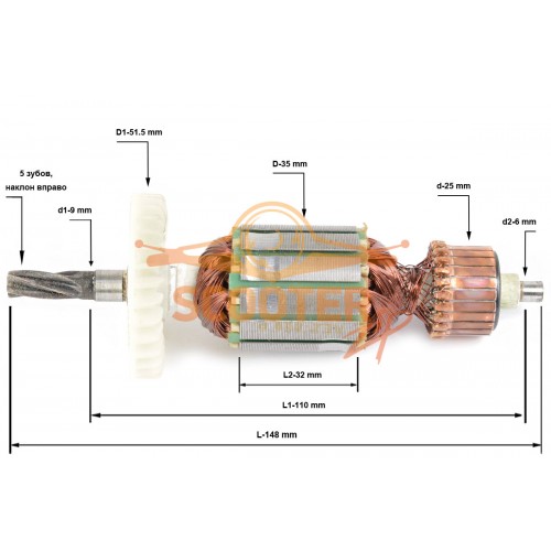 Ротор (Якорь) ИНТЕРСКОЛ подходит для лобзика БАЙКАЛ, МП 85Э (L-148 мм, D-35 мм, 5 зубов, наклон вправо)