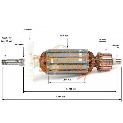 Ротор (Якорь) ИНТЕРСКОЛ УШМ-115/900 (L-166 мм, D-35 мм, резьба М8 (шаг 1.0 мм))