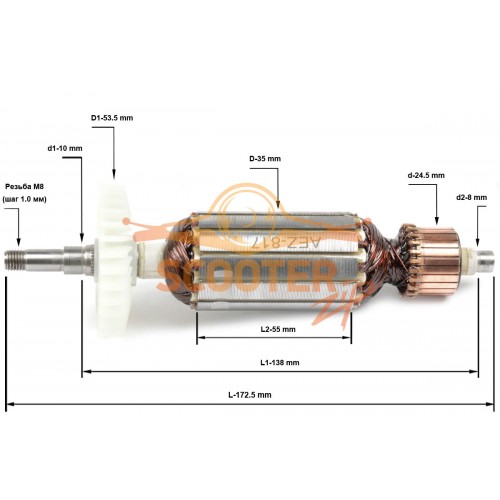 Ротор (Якорь) ИНТЕРСКОЛ УШМ-125/1000, FELISATTI AG125/1100 (L-172.5 мм, D-35 мм, резьба М8 (шаг 1.0 мм))