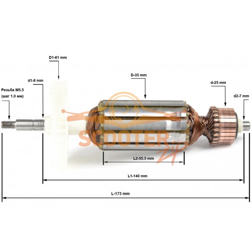 Ротор (Якорь) ИНТЕРСКОЛ УШМ-125/1100 (L-173 мм, D-35 мм, резьба М5.5 (шаг 1.0 мм))
