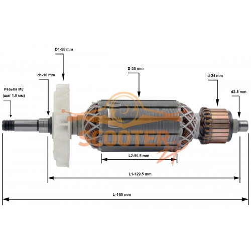 Ротор (Якорь) ИНТЕРСКОЛ УШМ-125/900 (L-165 мм, D-35 мм, резьба М8 (шаг 1.0 мм))